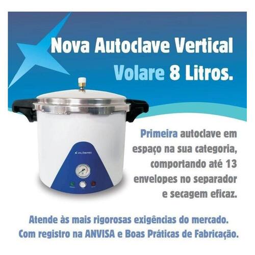Fabricada 100% no brasilRegistro anvisa: 82306119001Autoclave analógica volare 8 litrosPrimeira autoclave em espaço na sua categoria, comportando até 13 envelopes no separador que acompanha a autoclave, ciclo silencioso e secagem eficaz atendendo ás boas práticas de fabricação e com registro na anvisa. A autoclave vertical volare analógica 8 litros, desenvolvida para resolver de uma forma prática e simples as exigências de esterilização, dentro das normas da anvisa, construída com o que há de melhor em tecnologia e matéria prima, usando estratégias em segurança, praticidade e performance, para dar mais espaço, rapidez e economia para o usuário. Promove a esterilização através de calor úmido com acréscimo de pressão, para a esterilização dos instrumentos resistentes á pelo menos 134ºc pode ser utilizada em clínicas odontológicas, clínicas veterinárias, clinicas de estética, salões de beleza e laboratórios. Especificações técnicas:- capacidade: 8 litros- temperatura de trabalho: 121ºc a 124cº- pressão máxima: 1,5 kgf - diâmetro da câmara: 300 mm- profundidade da câmara: 120 mm- altura externa: 350 mm- largura externa: 480 mm- voltagem: 220- potência: 500 watts- corrente nominal: 220 volts 3 amperes - frequência: 50 a 60 hertz- peso: 8 kg- garantia 12 mesesContêm na caixa;- 01 autoclave vertical analógica 08 lt- 01 copo becker - 01 grade separadora de envelopes- 01 haste de despressurização- 01 manual guia rápidoDúvidas frequentes;1 - o autoclave é bivoltResposta: não, antes de realizar a compra do equipamento, verifique se a voltagem da rede em seu estabelecimento corresponde ao especificado no mesmo 110v ou 220v 2 - qual o tempo de ciclo Resposta: o processo proporciona um tempo de esterilização de 30 minutos e o tempo total do ciclo finalizado é em torno de 55 minutos a uma hora.3 - para o processo de esterilização adicionar apenas agua E qual a quantidade específicaResposta: de preferencia água destilada sobre a quantidade, coloque 200ml de água.4 - necessário a presença de um técnico para instalarResposta: não é necessária a presença de técnico especializado para instalar seu equipamento, o processo é bem simples e pode ser feito pelo próprio usuário. 5- possui aprovação na anvisaSim aprovada pela anvisa para todas as finalidades, odontológica, manicure, tatoo, dentre outras atividades. Mais dúvidas estamos a disposição, lugui commerce. Boas compras 0/