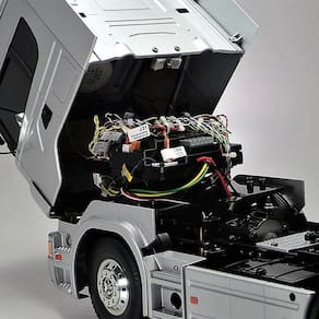 Descrição: Esta é uma edição especial do caminhão R/C Scania R470, o elegante modelo 4x2 que retrata um veículo pertencente à Série R, vencedora do prêmio de Caminhão Internacional do Ano 2005 da Scania. É uma ótima opção para aqueles sem tempo ou confiança para aplicar uma pintura em seu kit, pois as peças da cabine vêm pré-pintadas em alumínio brilhante TS-17 e recebem um revestimento de uretano para um acabamento bonito e duradouro. A Unidade de Controle Multifuncional (MFC-01) (incluída apenas para o mercado japonês) oferece operação de luz, som e vibração para acompanhar sua experiência com o caminhão R/C. Os sons do motor foram gravados digitalmente do caminhão real e, junto com a buzina de ar, troca de marchas e muitos outros sons realistas, permitem que você sinta que está dirigindo a coisa real. Faróis, luzes de freio e operações de piscas também estão disponíveis na ponta dos seus dedos. Características: