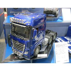 Tamiya 1/14 Tractor Trucks Mercedes Benz Actros 3363 6x4 GigaSpace Pearl Blue EP Car Kit #56354 Description: The 2012 Truck of the Year award-winning Actros series is the flagship of the world's leading truck manufacturer, Daimler AG (Germany). This R/C model assembly kit recreates the dual rear axle-driven Actros 3363 6x4 GigaSpace model, which runs on a 15.6-liter turbocharged inline-6 engine capable of 630hp. The model's highly detailed pre-painted body breathtakingly captures the powerful form of the truck, including depictions of auxiliary lights on cab roof and bumper. Its ladder frame chassis features aluminum side channels with resin cross members, while the suspension employs leaf springs and friction dampers. An assembly type 3-speed transmission allows gear changes via separately available 4-channel transmitter. Don't have the time, space or confidence to apply a paint job? Then this kit is for you - all body parts are pre-painted in a sumptuous shade of pearl blue, with clear topcoat applied. Assemble, paint small parts in semi gloss black, and your body is ready for use!