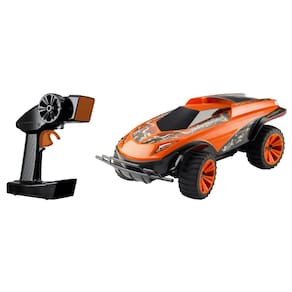 CARACTERÍSTICAS: Tração: Quatro rodas, com câmbio mecânico para potência máxima ou velocidade máxima Motor: Escovado Rádio: 2,4 GHz com direção proporcional Bateria: NiMH, estojo de plástico para proteção ao dirigir em terrenos acidentados Carregador de bateria: alimentado por CA Corpo: Plástico com traseira Wing Suspensão: Independente Amortecedores: Corpo de plástico Pneus: Banda de rodagem em chevron de baixo perfil Rodas: Plástico, cor laranja, 12 raios (os raios estão em grupos de dois), rodas de fácil troca encaixam no lugar, sem necessidade de ferramentas