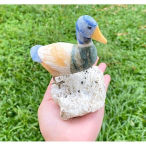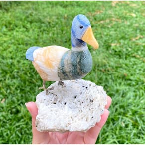 Amostra de Ave esculpida artesanalmente em pedra semipreciosa natural (minerais variados).