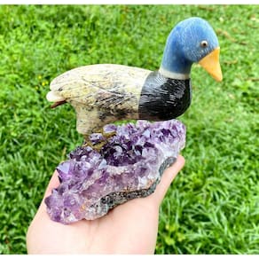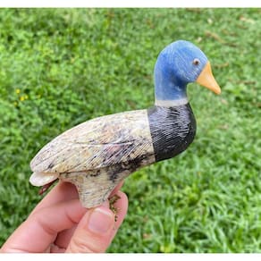 Amostra de Ave esculpida artesanalmente em pedra semipreciosa natural (minerais variados).