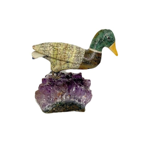 Amostra de Ave esculpida artesanalmente em pedra semipreciosa natural (minerais variados).