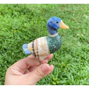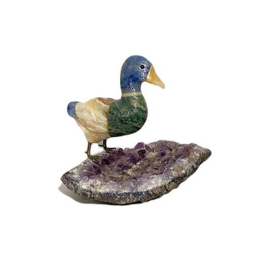 Amostra de Ave esculpida artesanalmente em pedra semipreciosa natural (minerais variados).