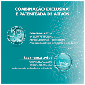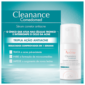 Cleanance Comedomed, o Sérum Corretor Antiacne de Avène, foi desenvolvido após 25 anos de pesquisas. Possui mecanismo de ação exclusivo e eficaz, que atua em toda as fases do ciclo da acne, graças ao seu ativo patenteado e 100% vegetal, Comedoclastin. Com textura leve, rápida absorção e alta tolerância, sua fórmula possui eficácia comprovada a partir de 7 dias de uso, com redução de 90% da acne. Único tratamento para peles extremamente oleosas, que atua diretamente nas células tronco, equilibrando a produção excessiva de sebo e suavizando a irritação da pele.