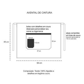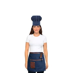 Chapeu de cozinheiro e avental de cintura da CASACHA possui bolsos frontais em couro e jeans. Contem: 1 Avental de Cintura Tamanho: 64 x 44 cm Material: Jeans e Couro 1 Chapeu do Chef Tamanho de circunferencia ajustavel Altura do chapeu: 28 cm Material: Jeans