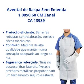 Avental de Raspa Sem Emenda 1,20X0,60 Zanel CA 13989 Proteção e Conforto para Profissionais O Avental de Raspa Sem Emenda foi desenvolvido para oferecer proteção e segurança em ambientes de trabalho que apresentam riscos de abrasão e escoriações, especialmente em atividades de solda e indústrias metalúrgicas, siderúrgicas ou marmorarias. Confeccionado em raspa de couro bovino, costurado com fio 100% algodão ou aramida, e equipado com tiras laterais para ajuste e fixação, este avental proporciona um excelente desempenho de proteção sem comprometer o conforto.