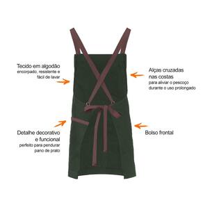 Avental e faixa de cabelo. Avental corpo inteiro com alças cruzadas nas costas e bolso frontal. Este modelo de avental com alças cruzadas é ideal para aliviar o pescoço durante o uso prolongado. Possui detalhe decorativo e funcional ao lado do bolso, perfeito para pendurar pano de prato. Feito para chef de cozinha, barista, jardinagem, pintura e outros. Este avental atende bem aos clientes mais exigentes priorizando conforto, qualidade e estilo. Produzido em tecido 100% algodao, facil de lavar e indicado para uso na maquina de lavar roupa.