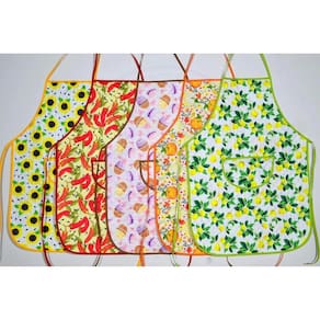 Composto por 5 aventais, cada um medindo 0,70x0,50m, esse conjunto oferece estampas variadas para você escolher a que mais combina com o momento. O avental de Flor de Girassol, Pimenta Vermelha, Limão Siciliano, Doces e Abóboras irá deixar sua cozinha ainda mais encantadora.