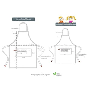 Contem: 1 Avental Adulto Tamanho: 76 x 64 cm 1 Avental Infantil Tamanho: 56 x 40 cm Material: 100% Algodao CASACHA especializada em aventais e jogos americanos profissionais