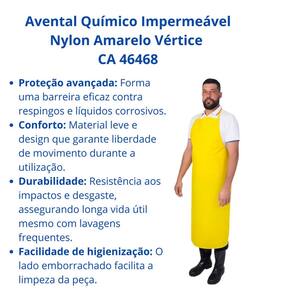 Adquira já seu Avental Químico Impermeável Nylon Amarelo CA 46468 e garanta proteção, segurança e conforto para suas atividades em ambientes com riscos químicos!