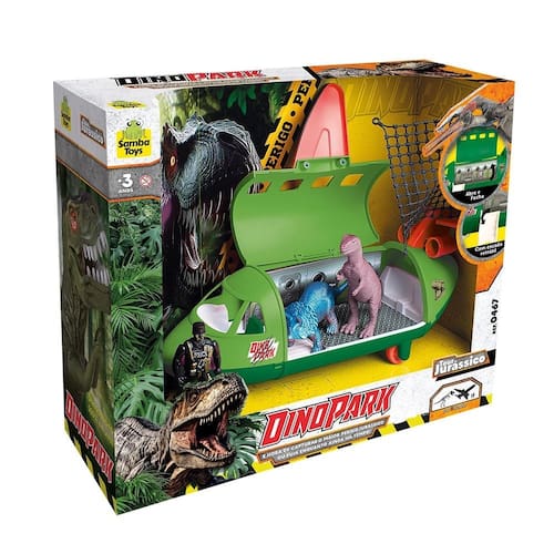 Avião Jurássico, avião com porta abre e fecha, escada retrátil, 2 dinossauros, 1 soldado e 1 rede, verde, 34 cm, plástico, 5 peças, +3 anos - Samba Toys