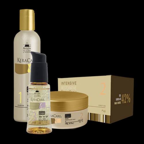 • KeraCare Intensive Restorative Shampoo 240ml: Shampoo de fortalecimento capilar que contém extratos botânicos e aminoácidos que suavizam o toque, melhoram a hidratação e devolvem aos fios seu equilíbrio nutritivo natural recuperando maciez, brilho e leveza. Os cabelos ficam sedosos, macios e refletem um lindo brilho. O enxágue e o desembaraçar são simples e os fios continuam soltos durante toda a secagem, estilização e cuidado diário. Indicação: Cabelos fragilizados por processos químicos contínuos como descolorações, alisamentos, permanentes, coloração ou escovas.
