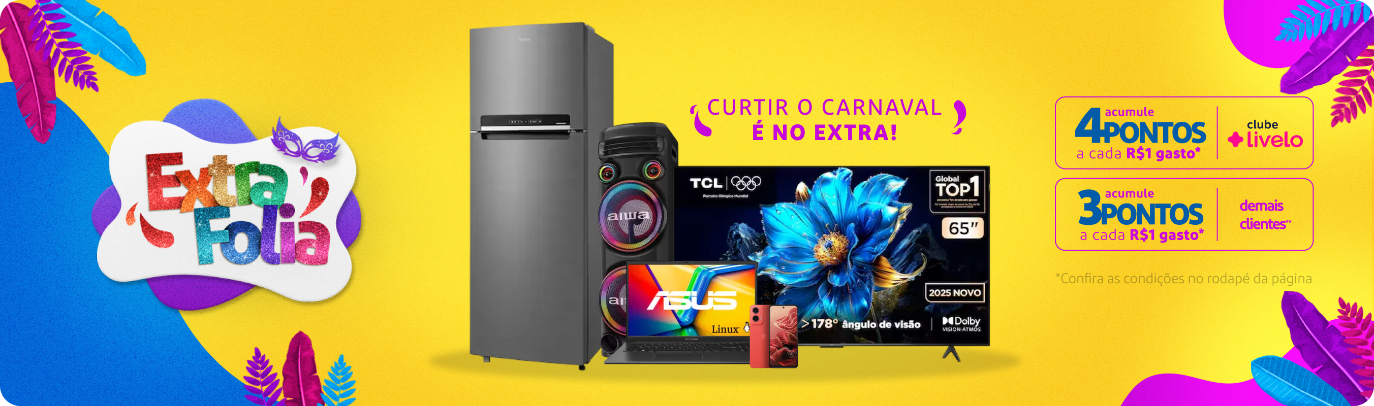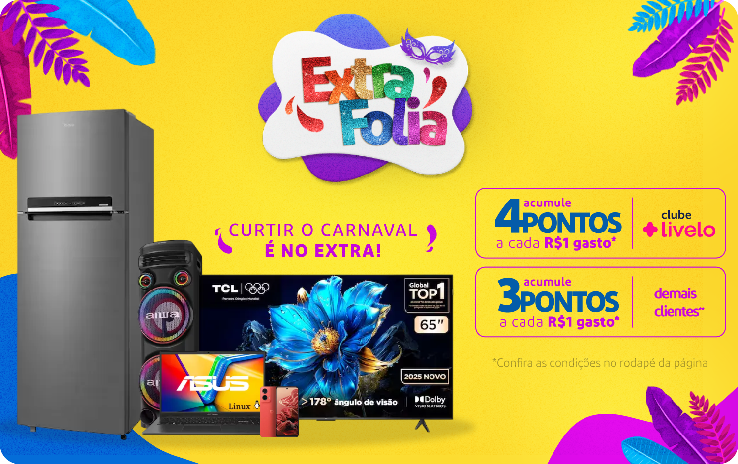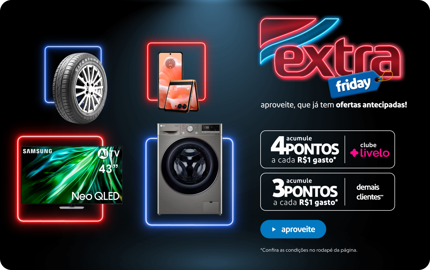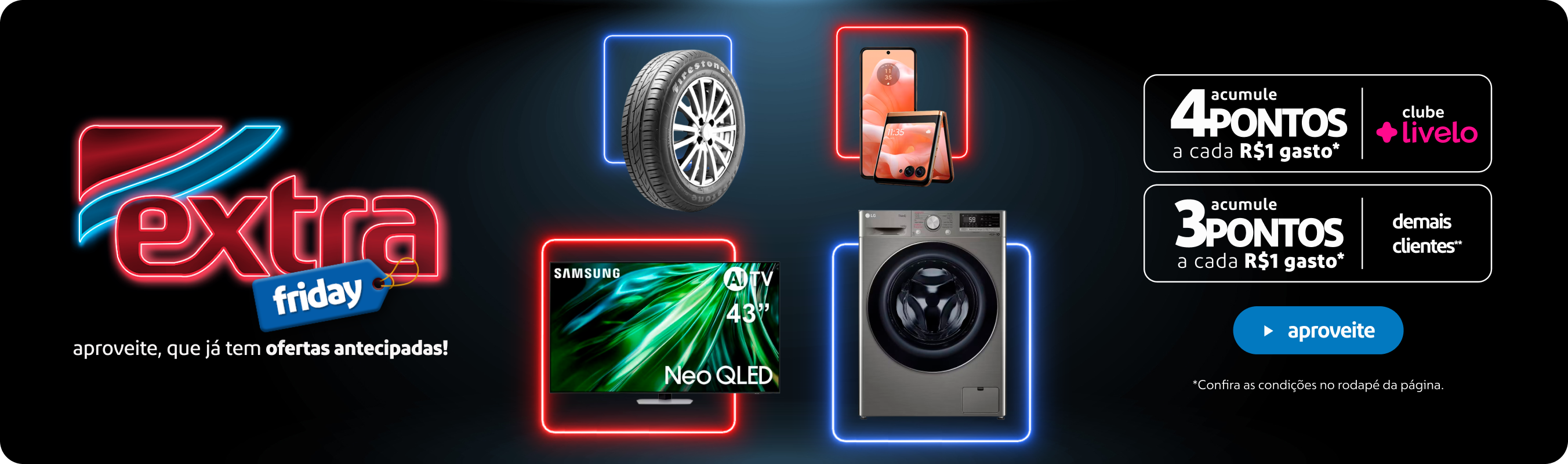 Os Pontos/Milhas adquiridas nas compras pelo Hotsite serão creditados na conta do Participante em até 15 dias corridos após a entrega do produto. O Extra.com.br e a Livelo não se responsabilizam pela informação incorreta, pelo Participante, do número de CPF.