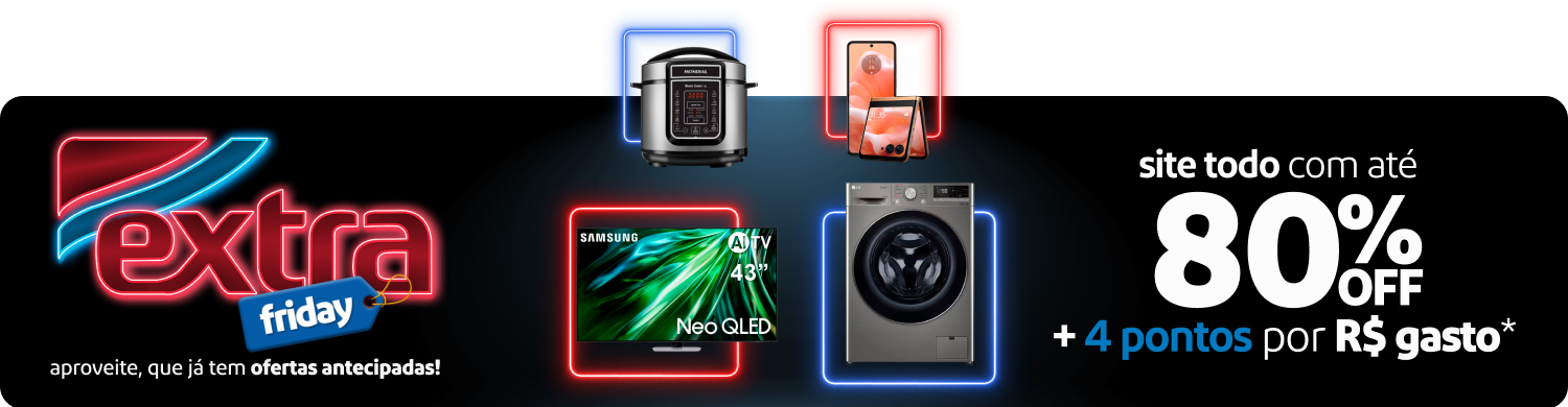 Os Pontos/Milhas adquiridas nas compras pelo Hotsite serão creditados na conta do Participante em até 15 dias corridos após a entrega do produto. O Extra.com.br e a Livelo não se responsabilizam pela informação incorreta, pelo Participante, do número de CPF.