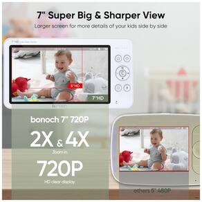 Cuide sem esforço de dois bebês monitor de bebê bonoch com 2 câmeras permite que você fique de olho em ambos os bebês na tela lado a lado com a função de tela dividida. O monitor HD 720P de 17 centímetros oferece qualidade cristalina com imagens nítidas e 10 vezes mais detalhes. O monitor de bebê bonoch faz um loop de vídeo de 4 câmeras a cada 15 segundos no modo de tela única ou a cada 30 segundos no modo de tela dividida. Diga adeus ao incômodo, e olá para uma maneira mais simples e eficiente de cuidar de seus pequeninos Sem preocupações do dia para a noite Diga adeus às preocupações dia e noite com o monitor de bebê bonoch A visão noturna automática fornece imagens nítidas em preto e branco, mesmo na escuridão total, sem luzes vermelhas para perturbar seu bebê. A bateria de 6000mAh oferece monitoramento de 10 horas no modo normal e 22 horas no modo VOX, o que economiza bateria interrompendo a transmissão em salas silenciosas, alertando você apenas no primeiro som Fique conectado ao seu bebê Nosso monitor de bebê apresenta som em tempo real, conversa bidirecional e detecção de temperatura. Receba alertas quando eles chorarem e use a conversa bidirecional para confortá los ou volte rapidamente para o lado deles. O display de temperatura interna informa sobre o nível de conforto do seu bebê. Fique tranquilo com o bonoch, mesmo se estiver em outra sala ou ocupado com outras tarefas Cobertura de toda a sala Fique de olho no seu bebê de qualquer lugar da sua casa com nosso monitor de bebê. A lente da câmera para bebês faz uma panorâmica de 355 e inclina 115 para capturar todos os cantos da sala, enquanto o zoom de 4x permite que você veja mais de perto. Você nunca vai perder nada, mesmo que seu bebê escape do berço. Desfrute de uma transmissão ao vivo clara e estável com cobertura sem fio e capture os momentos de crescimento do bebê Sem Wi Fi, e confiável A conexão FHSS de 2,4 GHz garante uma transmissão ao vivo segura e privada que é apenas para você. Proteja você e sua família contra vazamento de privacidade. Não é necessário WiFi, download de APP ou criação de conta