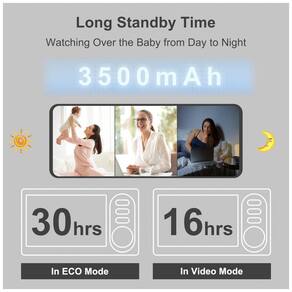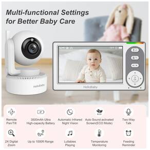 O Monitor de Bebê HelloBaby vem com uma potente bateria de 3500mAh que dura até 30 horas no modo ECO e 16 horas no modo não-ECO. Sua tela de 10 cm proporciona um amplo campo de visão, facilitando aos pais observar seus bebês. Equipado com tecnologia FHSS de 2.4GHz, oferece alcance de aproximadamente 304,8 metros sem a necessidade de conexão WiFi ou aplicativo, garantindo privacidade e segurança. Com rotação de 350 graus e inclinação de 120 graus, o monitor permite visualizar toda a área do quarto. Possui visão noturna automática, comunicação bidirecional, modo ECO que desliga a tela quando não há som detectado, reprodução de 8 canções de ninar, monitoramento de temperatura e alarmes para alimentação.