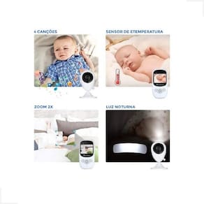 -monitoramento de temperatura. Sabe a temperatura do quarto do seu bebê todo o dia sem preocupações; -detecção sonoro: caso seu bebê esteja chorando, receba aviso e então você pode tocar 4 tipos de canção sonora para acalma-lo; -áudio bidirecional entre a câmera e o monitor, você pode conversar com o bebê; -visão noturna automática; -até 8 horas de vida da bateria no modo VOX . Não precisa carregar a bateria para o monitor na noite inteira no modo VOX; -4 Canções de ninar na memória, ajuda o bebê a se acalmar e cair no sono; -sinal digital de longo alcance seguro e livre de interferências, até 100 metros; -monitor colorido LCD 2.4 polegadas de alto contraste;