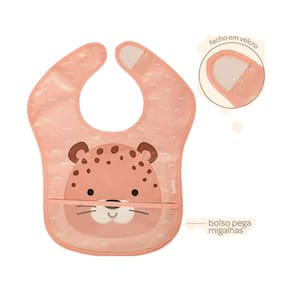 Babador com bolso pega migalhas infantil oncinha menina buba cor: rosa o babador com pega migalhas oncinha da buba possui tecido impermeavel e bolso pega migalhas, ideal para evitar que o pequeno suje a roupinha. O fecho em tiras aderentes se ajusta facilmente ao pescoco do bebe. Impermeável fecho em tiras aderentes