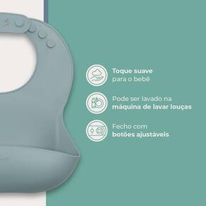 O Babador de silicone com pega-migalhas é projetado para uso por bebês a partir de 6 meses de idade e conta com 4 ajustes de tamanho na altura do pescoço. Ele ainda é super prático na hora da limpeza, podendo ser lavado na máquina de lavar louças.