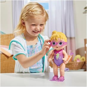 Esta boneca pra brincar na água é perfeita para meninos e meninas. Vem com óculos e 2 nadadeiras. A boneca articulada de 26 cm vem com uma linda roupa de banho com estampas de criaturas marinhas. É uma boneca divertida feita para brincar na água.