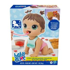 Baby Alive Hora da Papinha Morena - Hasbro F2618 É hora do lanche As crianças podem criar lanchinhos de mentirinha para a boneca com a comida reutilizável para a boneca e o molde incluídos. A boneca articulada de 20 cm pode ficar sentada ou fazer poses como se estivesse engatinhando. A fralda de plástico da boneca pode ser aberta para limpar a caquinha. Vem com babador removível, 1 pote de comida sólida para boneca, molde de lancheira e garfo/colher. A boneca Baby Alive Hora da papinha é um excelente presente
