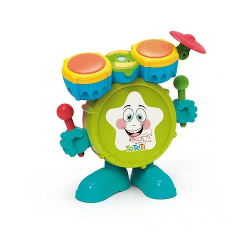 Para dar um show no mundo do faz de conta, brincar de tocar os tambores e o prato com as mãos ou com o par de baquetas removíveis com chocalho e desenvolver a coordenação motora fina.