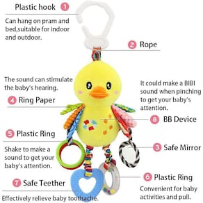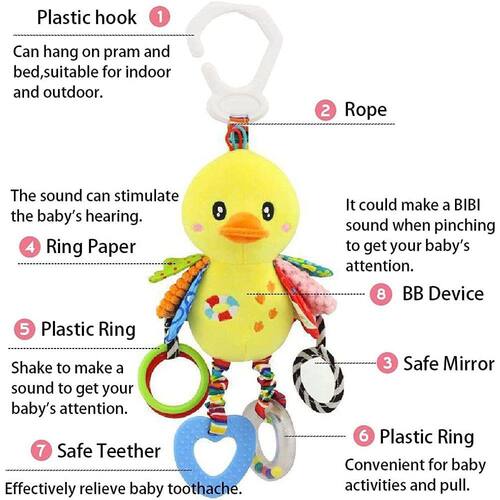 "Baby Car Toys & Stroller Toys?Álva que você pode pendurar esse brinquedo de chocalho recheado no carro do bebê, carrinho ou cama com gancho. Conveniente para pendurar e derrubar, um companheiro perfeito para o seu bebê a cada momento. ?Multifunção?Teether + Ring Bell + Ring Paper + Discovery Mirror + dispositivo BB + Rattle. Atrai a atenção do bebê, estimula a curiosidade, pode exercitar a capacidade de aperto do dedo do bebê, aumentar a força do pulso, puxar o treinamento, melhorar a capacidade prática, promover a mão do bebê, o desenvolvimento abrangente da coordenação dos olhos e do cérebro. Um grande brinquedo de bicho recheado para a pré-escola. ?Rattle Toys with Teether?Made de material seguro para permitir que seu bebê mastigá-lo, efetivamente apaziguar a ansiedade de dentes. ?Anel de plástico?Com anel circular transparente e anéis de geometria. Trema para fazer um som para chamar a atenção do seu bebê. Conveniente para atividades de bebê e puxar, exercitar o aperto e puxar do bebê. ?Brinquedos De pelúcia animal?O animal e cor brilhante exercitam o sentido visual do bebê. Animal para sua escolha: Coelho / Pato / Boleta / Pássaro.
