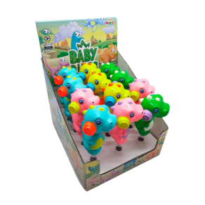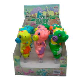 Mas a diversão não para por aí! O Baby Dino 2 está conectado à parte superior de um tubo cheio de deliciosas balinhas sabor Tutti Frutti, combinando a alegria dos brinquedos com o prazer de saborear doces irresistíveis. Cada display vem com 12 unidades, tornando-o perfeito para distribuir em festas infantis, como lembrancinha de aniversário ou até mesmo como uma recompensa doce durante o dia.