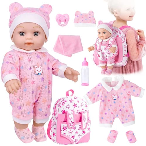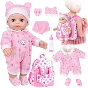 - O pacote inclui: boneca e roupas de bebê de 30,5 cm, mochila, toalha, mamadeiras, mamilos, meias, chapéus.