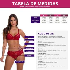Busto 90 a 94cm / Cintura 79 a 83cm / Cintura Média 83 a 87cm / Quadril 93 a 96cm