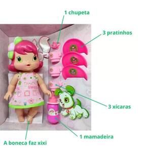 Baby moranguinho chazinho da tarde mimo toys 4003 A Boneca Moranguinho Amiguinha Articulada - 30 Cm da Mimo chegou para você se divertir e brincar muito. A Boneca Moranguinho Amiguinha mede aproximadamente 30 centímetros de altura, vem com lindos acessórios, tem cerca de 5 pontos de articulações, nos braços, pernas e cabeça. As meninas vão adorar brincar com ela.Especificações Técnicas:- Marca: Mimo- Material: Plástico e Vinil- Idade Recomendada: + 3 anos- Dimensões aproximadas do produto: Altura: 30 cm Largura: 10 cm- Peso: 500 g- Conte: 1 Boneca baby moranguinho chazinho da tarde- Registro 008650/2055Homologação Inmetro: CE-BRI/IQB 006465 55291/22-010