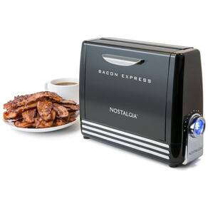 Cook up to 6 strips of bacon in minutes Recommended for use with regular cut store bought bacon Vertical cooking drains away grease Removable non stick cooking plate and insulated door liners allow for easy cleanup Slide out drip tray catches bacon grease Illuminated cooking dial with timer Cool touch handles Chrome accents