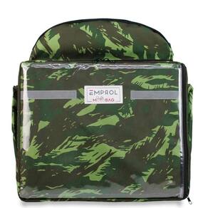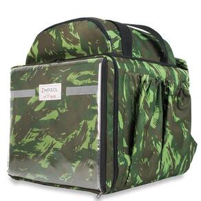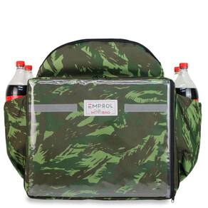 Confeccionada em poliéster camuflado plastificado, este modelo tem 4 bolsos laterais para garrafas pet até 2l, um compartimento superior com fechamento em zíper que comporta até 3 garrafas pet de 2l cada ou 2 pizzas de 8 fatias. Sua caixa de isopor armazena até 6 caixas de pizza de 8 fatias.
