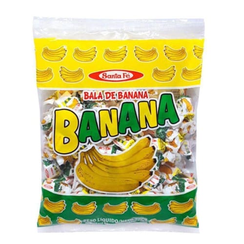 Balas mastigáveis Santa Fé sabor banana. Peso líquido total 500 gramas.