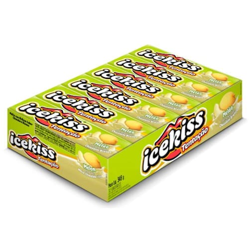 Caixa contendo 12 unidades de Drops de bala IceKiss Tentação Melão com recheio sabor Chocolate Branco com 29 gramas cada. Peso líquido total 348 gramas.