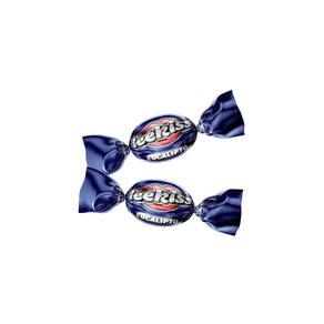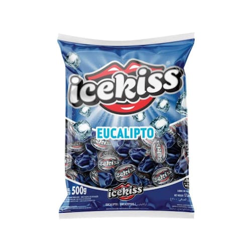 Bala dura Icekiss sabor artificial de eucalipto. Colorida e aromatizada artificialmente. Peso líquido total 500 gramas.