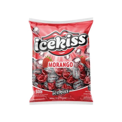 Bala dura Icekiss sabor artificial de morango e eucalipto. Colorida e aromatizada artificialmente. Peso líquido total 500 gramas.