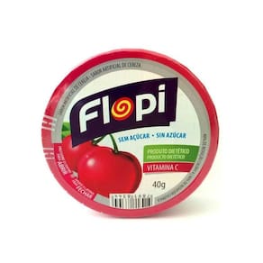 Bala Flopi sem açúcar sabor cereja colorida e aromatizada artificialmente. Para dietas com restrição de açúcares. Peso líquido total 40 gramas.