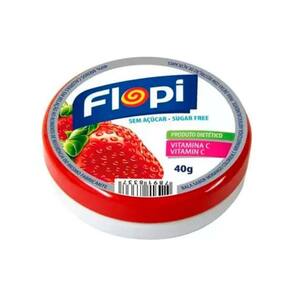 Bala Flopi sem açúcar sabor morango colorida e aromatizada artificialmente. Para dietas com restrição de açúcares. Peso líquido total 40 gramas.