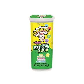 Mini Balas Extreme Sour 49g Warheads Warheads, é a marca mundialmente conhecida pela produção de balas super ácidasSão perfeitas para os adoradores de sabores extremamente azedos.Essa versão apresenta as Minis Hard Candy, que vêm nos sabores: cereja preta, maçã verde, limão, melancia e framboesa azul.A warheads é uma marca frabricada atualmente pela Impact Confections, e mundialmente famosa pelos seus doces extramamente azedos. Ingredientes:- Xarope de milho, açúcar, ácido málico, ácido cítrico, goma de acácia, amido modificado (ajuda no processamento), óleo vegetal, sabor artificial, óleo mineral, azul 1, vermelho 40, amarelo 5. Cuidados:- Manter em local limpo, fresco, seco e sem cheiro.