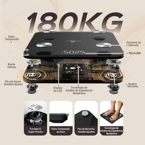- Com capacidade de até 180 kg, plataforma de vidro temperado, tela digital em LED e memória para até 10 perfis de usuários, é perfeita para o uso no dia a dia, seja individual ou familiar.