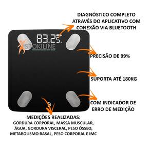A balança de bioimpedância é compacta e ultra resistente, suporta até 180 kg. Possui um sistema super prático guiado por app (compatível com Android e iOS). Permite um diagnóstico completo, sendo possível o acompanhamento gráfico de evolução através do app.Características:- Suporta até 180 Kg;- Acionamento e desligamento automático;- Altíssima precisão (>99%);- Base em vidro temperado;- Utiliza pilhas AAA (inclusas);- Indicador de carga de pilhas;- Indicador de erro de medição;- Vidro temperado resistente de 5mm;- Medições realizadas: gordura corporal, massa muscular, água, gordura visceral, peso ósseo, metabolismo basal, peso corporal e IMC.Informações Técnicas:- Área de 28x28cm;- Diagnóstico completo através do app (Okok);- Sistema bipolar com 4 eletrodos;- Aplicativo com gráfico e registro de histórico; - Aviso de sobrepeso.
