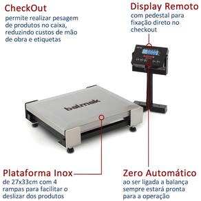 Desenvolvida para oferecer agilidade, precisão e confiabilidade em operações de frente de caixa. Compacta, ergonômica e fácil de instalar, ela é ótima para supermercados, atacarejos, hortifrutis, padarias e comércios que exigem pesagem rápida e eficiente diretamente no balcão. Seu prato em aço inox AISI 304 assegura alta durabilidade e higiene, além de possuir 4 rampas laterais, facilitando o deslizamento de produtos durante a pesagem. O equipamento conta com display LCD extra grande, com backlight, proporcionando leitura clara tanto para o operador quanto para o consumidor. O modelo acompanha indicador de peso remoto em torre, com gabinete em ABS preto, podendo ser posicionado com inclinação horizontal ou vertical. Além disso, possui duas opções de comunicação serial (RS-232 e USB), permitindo integração com sistemas de automação comercial e PDV, oferecendo ainda proteções contra interferências e sobrecarga mecânica, assegurando maior vida útil e estabilidade nas operações. Capacidade 30kg com divisão de 5g Perfeito para checkout e pesagem de produtos com alta precisão. Plataforma inox AISI 304 com 4 rampas laterais Mais durabilidade, higiene e facilidade no deslizamento de mercadorias. Display LCD grande com Backlight Leitura fácil e rápida mesmo em ambientes com pouca iluminação. Comunicação RS-232 e USB Integração eficiente com automação comercial e sistemas PDV. Proteções avançadas e zero automático Segurança contra interferências eletromagnéticas e sobrecarga mecânica, sempre pronta para operar.