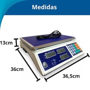 Medidas da balança: 33 x 34 x 11,5 cm Medida da bandeja: 34,5 x 23 cm Precisão: 1/3000 f.S. Entrada ac: 110/220 bivolt Capacidade: 40 kg com escala de 2 g Painel de exibição: 16 dígitos Display de peso: 5 dígitos