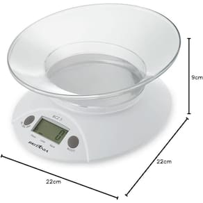- A Balança também possui display digital e visor de cristal líquido de 4x2cm, garantindo precisão. Com capacidade máxima de 5kg, permite verificar o peso de diversos tipos de alimentos.