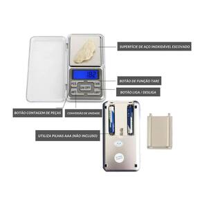 Características Alta Precisão: Mede com uma precisão impressionante de 0,1g, garantindo resultados exatos para suas necessidades mais detalhadas. Capacidade Máxima: Suporta até 500g, ideal para uma ampla gama de aplicações. Design Compacto e Portátil: Seu tamanho reduzido permite fácil transporte e armazenamento em qualquer bolso ou bolsa. Tela LCD: Exibe as medições de forma clara e fácil de ler, com iluminação para melhor visibilidade em diferentes condições de luz. Função Tara: Permite zerar o peso da embalagem ou recipiente, facilitando a medição de apenas o conteúdo. Unidades de Medida: Pode alternar entre gramas g , onças oz , carates ct e grãos gn , adaptando-se às suas necessidades específicas. Cor: Disponível em prateado ou cinza, com acabamento elegante e moderno. Bateria Inclusa: Funciona com baterias geralmente AA ou AAA incluídas, garantindo praticidade e mobilidade.