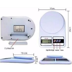Dimensões: 25 x 19 x 4,5 cm. Cor: branca Dimensão do prato: 15 cm. Prato em plástico sem bordas Função tara auto calibração Escala em g e oz Visor lcd com desligamento automático ou manual Funciona com 2 pilhas aa Capacidade de peso de 1grama até 10 kilos com graduação de e em 1 grama. Peso: 500 gr .