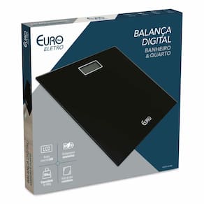 Especificações técnicas: - Cor: Preto - Marca: Euro Eletro - Modelo: BAL7894-PT - Material: vidro temperado / ABS / Aço - Capacidade máxima: 180kg - Capacidade mínima: 2,5kg - Unidades de medida: kg ou libras - Vidro de alta resistência - Amplo visor em LCD