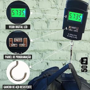 Balança digital portátil de mão para bolsa mala peixe até 50kg Balança digital portátil de mão para bolsa mala peixe até 50kg Despachamos em até 24hrs úteis. - balança digital portátil para o dia-a-dia com função tara, desligamento automático; - display de 4 dígitos com números grandes para melhor leitura; - botão: on/off; - muito fácil de usar, com ótima precisão; - ideal para produtos com peso superior a 100g e inferior a 50kg; - unidades de medida: kg; - capacidade máxima de 50 quilos; - muito leve e prática; - possui gancho de alta qualidade, fabricado em aço, para pesagem; - possui tara e modo de bloqueio e memorização do peso; - fonte de alimentação: 2 pilhas aaa - não inclusas (indicação - usar somente pilhas alcalinas, para que se tenha um melhor proveito da balança); - indicado para uso profissional em pesca, feirantes etc.; - pode ser utilizada para pesar malas para viagem em avião, produtos para os correios e etc. - apropriada para uso doméstico, cozinha, comércio, pesca, bagagens, atividades ao ar livre. ----------------------------------------- Itens inclusos: 1 (uma) - balança digital portátil de mão para bolsa mala peixe até 50kg Marca: Sunlight